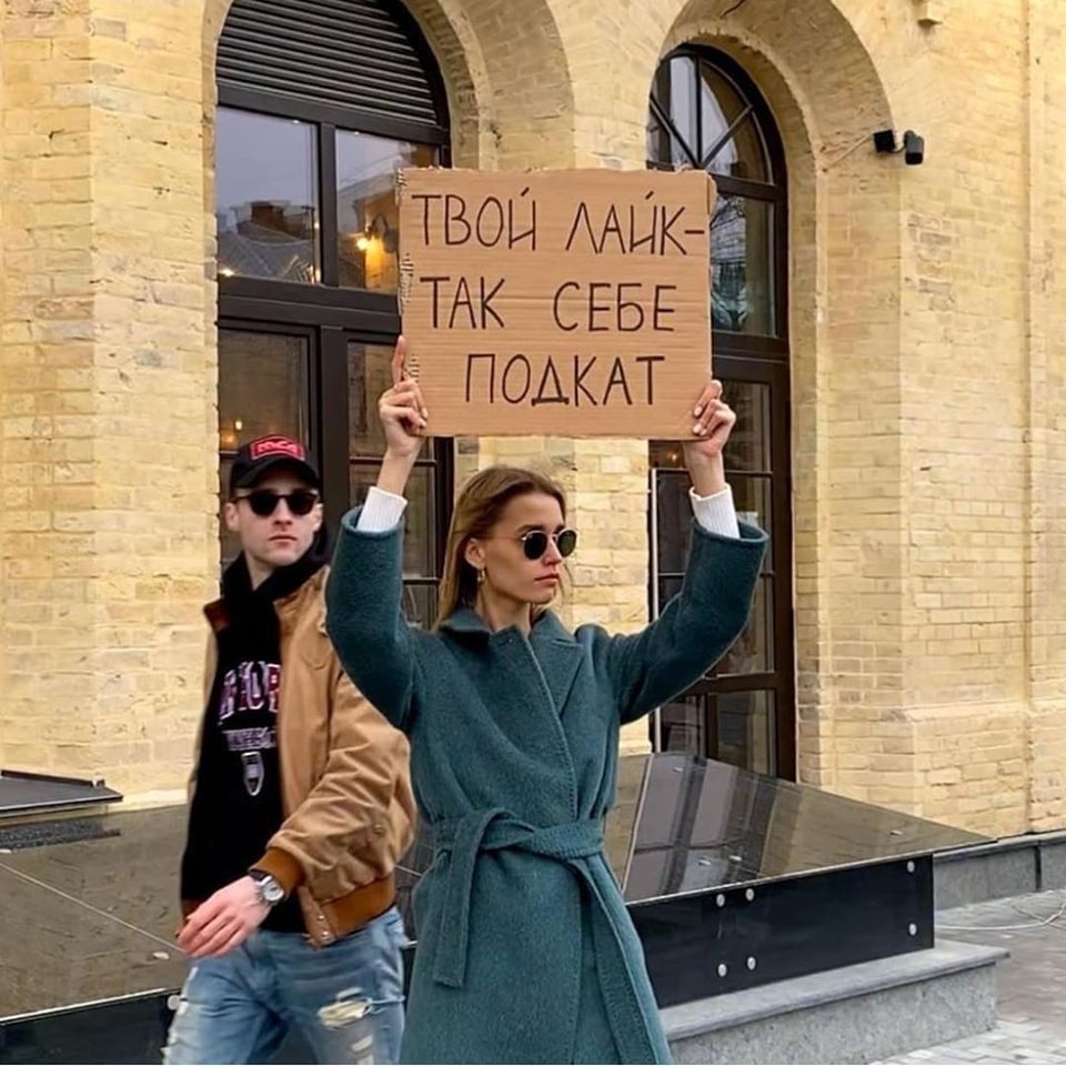 Худая изможденная девушка держит плакат с надписью, смысл которой я не понял ни с первого, ни с пятого раза. Просил Нату Катамадзе объяснить - она все знает. В Натыном переводе, кароче, так: одним лайком - грит девушка, меня не заклеишь. Давай, ухаживай по настоящему, я за лайки, очень грубо говоря, не даю.