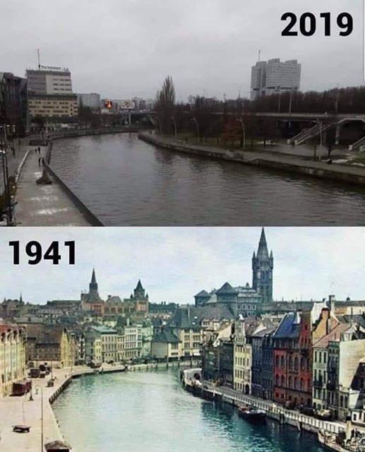 На следующем фото Кенигсберг при немцах, и Калининград при русских. Годы указаны. Фотографии разных лет, снятые с одной точки, то же место.