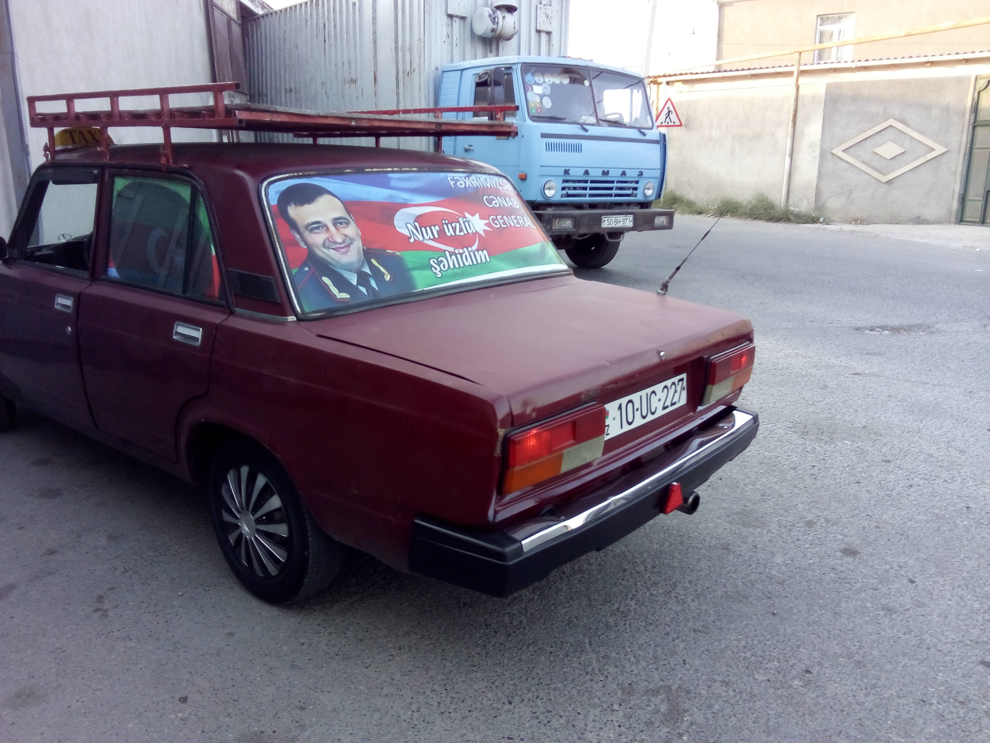 Заметны автомобили с изображениями нашего генерала-шехида, отразившего атаку фашистов в июле, в Товузе