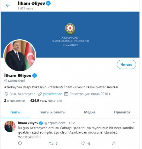 Очень важная победа для десятков тысяч джабраилцов. Представляю их радость и ликую вместе с ними. Да здравствует победоносная азербайджанская армия!