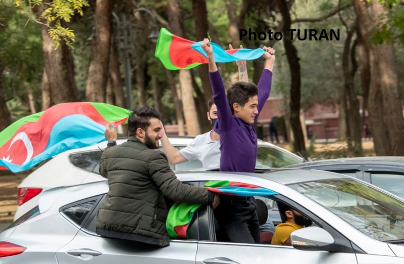 Сегодня такой день. В Баку гигантское количество молодежи танцует, гоняет на автомобилях с развевающимися флагами, демонстрирует плакаты [...], распевают мейхана - восточные частушки, в которых высмеиваются бежавшие с поля боя [...] и опять в куплетах повторяется комичное имя бородатого [...].