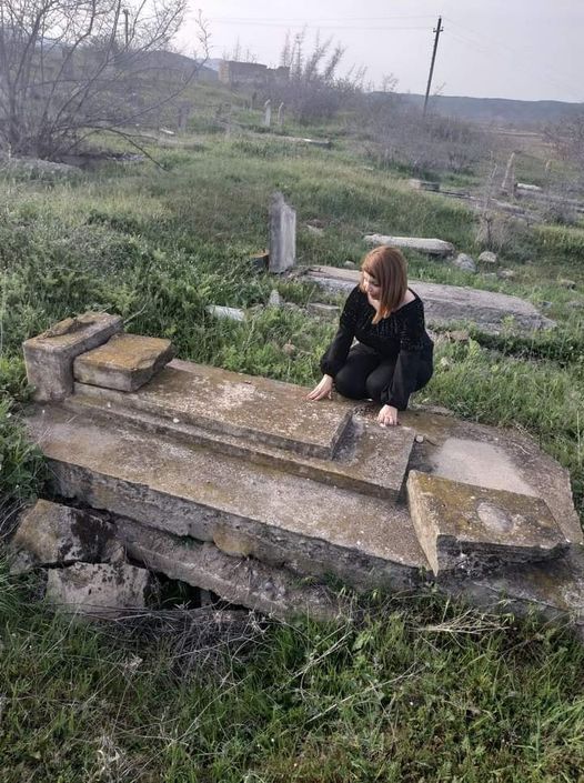Фото к теме достоинства, поднятую послом Франции в Армении. Журналистка Афет Телмангызы вернулась в освобожденное в войне свое село. Нашла могилу отца, в разрушенном виде, как и все кладбища и могилы в бывшей оккупированной зоне. Скажите ей о достоинстве Армении, и она вам ответит