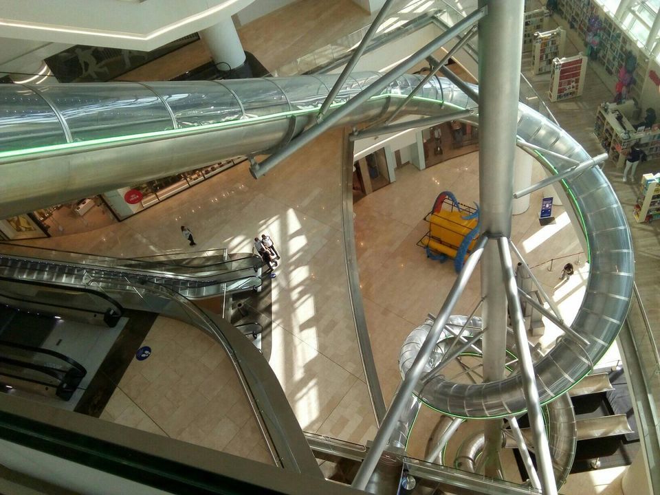 Вниз еще можно скатиться, или съехать в этой прозрачной трубе, если не страшно. С пятого то есть этажа до первого. Полет стоит три маната. Аттракцион еще не действует, но все готово принять первых храбрецов.