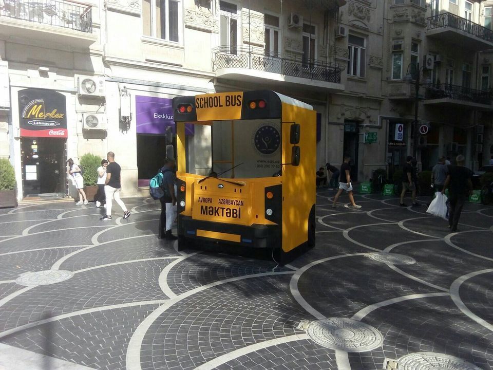 Сначала я решил, что на улочку каким то образом заехал школьный автобус. Потом рассмотрел, а это реклама платной школы, в которой детей развозят в таком автобусе