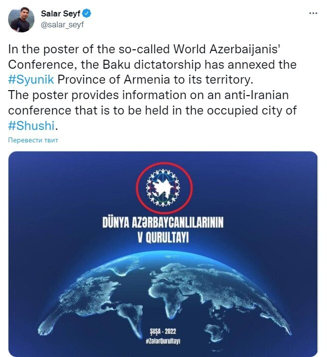 Искал информацию про этого Сейфеддина, впервые мной виденного. Разумеется, сразу выявились его проармянские связи. Оказывается, он прогневался на участников пятого конгресса в Шуше, потому что в иллюстративной части визитки конгресса усмотрел посягательство на армянский Сюник - азербайджанский Зангезур. Когда 28 лет армяне разрушали весь Гарабах, убив и изгнав оттуда мусульманское население, псевдоисламец Салех молчал. А тут разгневался.