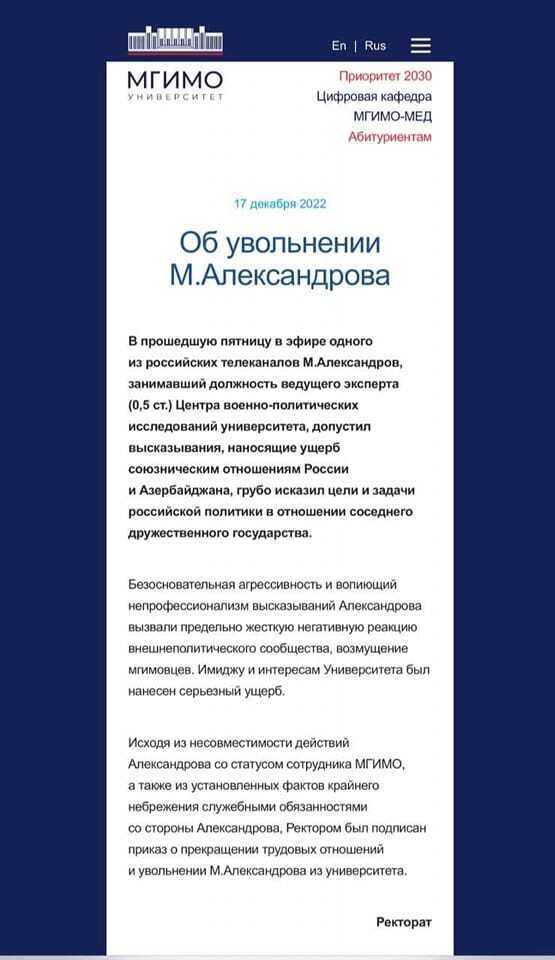 Не могу пройти мимо вчерашней новости об увольнении некоего эксперта-политолога из МГИМО Александрова за призыв бомбить Баку.  МГИМО очистился от явного идиота. Но таких в московских коридорах много, некоторые упражняются на кремлевских телеканалах. Почему их не увольняют? Среди них не только призывающие разрушить Киев, Соловьев требовал уничтожения Харькова. До Александрова про Баку в уничтожительном аспекте говорил Жирик и некоторые ныне живущие. Почему их не наказывают?