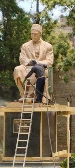 Второй пункт азербайджанского недовольства: город Баку весь перекрашивают в подготовке к ООН-вскому саммиу COP29, в ноябре. Маляры дошли до памятников, на фото перекрашивают скульптуру Мирза Алекбера Сабира, в центре Баку.