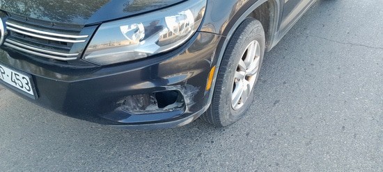 на фото: мой ущерб на 200 манат. Колесо разорвалось и легко пострадал пластмассовый бампер. :