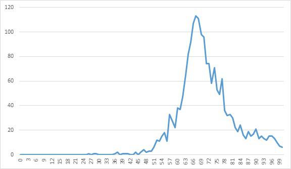 Вот распределение участков по явке на выборах президента Армении 2008 года. Выглядит в целом нормально, хотя справа виден «хвост» из участков с повышенной явкой. Можно сравнить с графиком распределения голосов на выборах парламента России, который составил математик Сергей Шпилькин и представил в статье «Двугорбая Россия»[17]. Они повышают результаты Incumbent-а, но не изменяют принципиальный результат. За одним исключением. Поскольку Серж Саргсян получил 52.8% голосов, возможно, был бы второй тур, катастрофический для власти. Но оппозиция была убеждена, что Левон Тер-Петросян получил именно больше голосов, что просто не соответствует действительности.