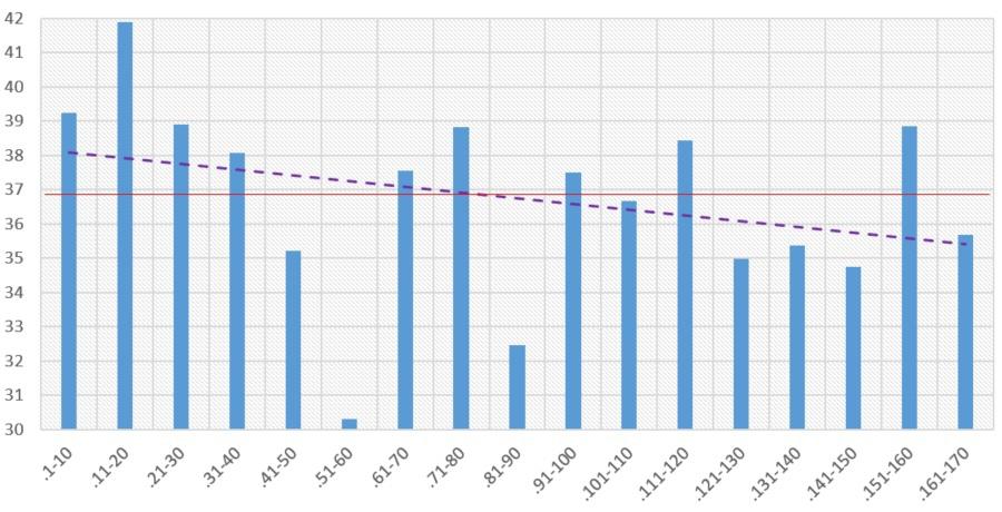 Всего в списке 170 человек. Но поскольку в Совете Старейшин всего 65 мест, разумеется, попадут не все. Вероятно, в Совет попадет примерно 48-53 представителя блока. Еще следует учитывать возможность самоотвода части кандидатов, как это бывало в прошлом на парламентских выборах. Если распределить список блока «Мой Шаг» по десяткам, то мы увидим, что первая часть списка в целом старше среднего возраста списка, тогда как вторая половина – моложе. Самые старшие также находятся ниже середины. Данные представлены на графике ниже.