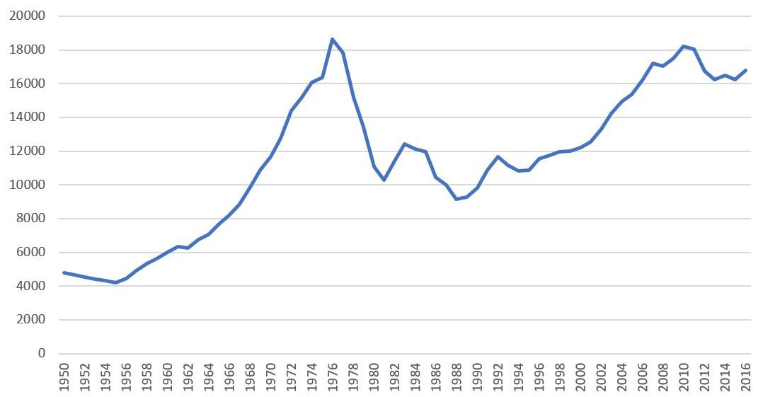 Далее рассмотрим динамику ВВП на душу населения (есть данные начиная с 1950 года).