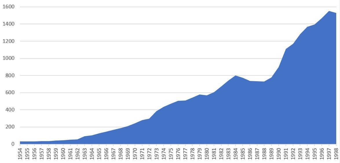 Мы видим, как после действий Моссадыка добыча нефти упала в 20 раз и, хотя на графике это выглядит не столь значительным, учитывая большие объемы нефтедобычи впоследствии, тогда это было равно катастрофе.