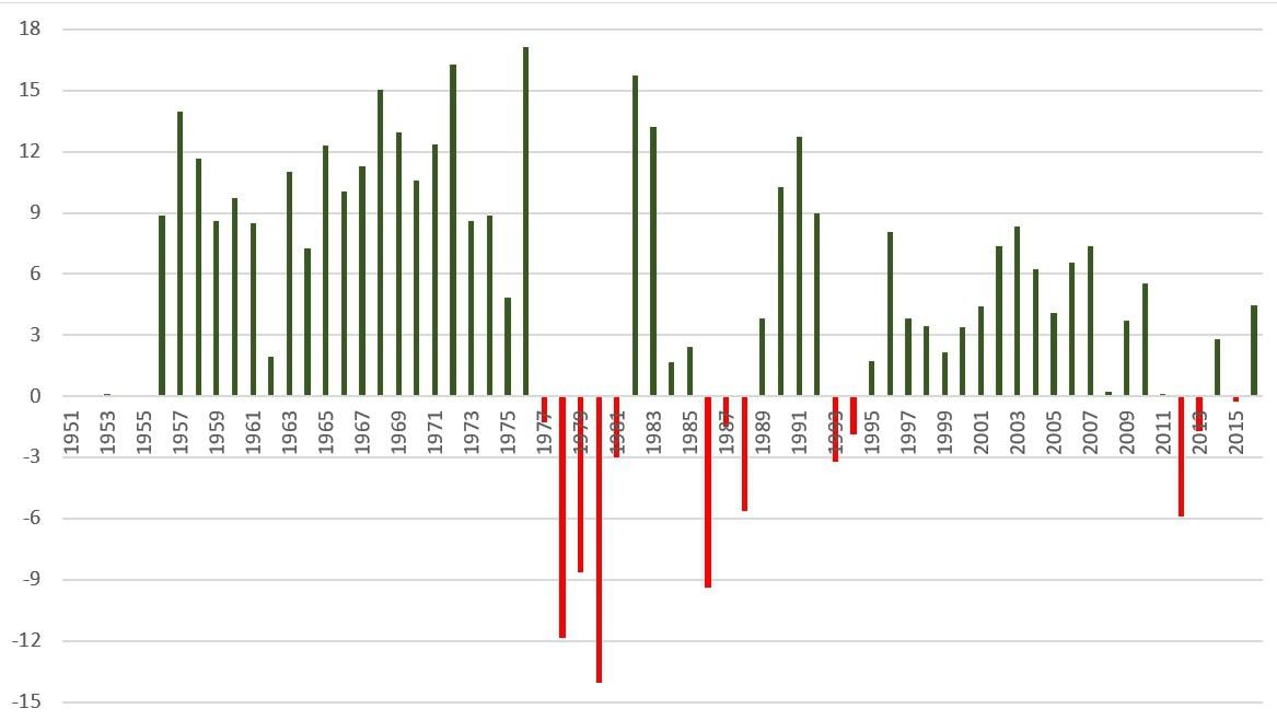 Попробуем исключить фактор роста населения, который оказывал серьезное влияние на подушевые показатели: в 2016 году население было ровно в 5 раз выше, чем в 1950 году. Никакое правительство не сумеет угнаться за таким темпом роста (кстати, именно поэтому еще при Хомейни началась политика ограничения рождаемости). На графике ниже – динамика реального роста ВВП (весь ВВП, без учета численности населения).