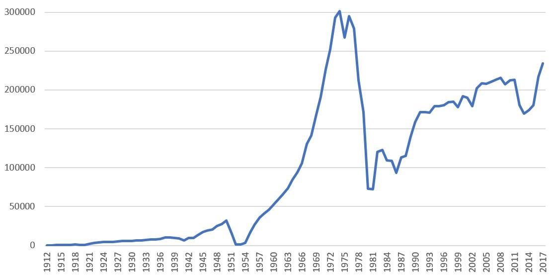 Начнем с нефти. На графике показана добыча нефти в Иране с 1912 по 2017 год, в тысячах тонн