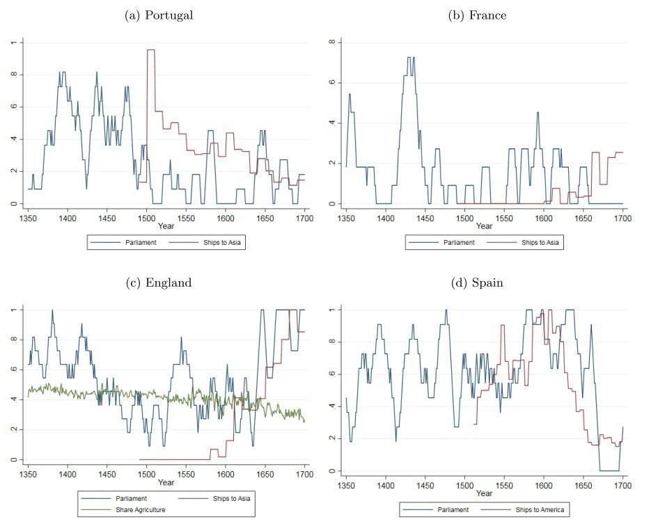 В современной публикации (Magalhaes and Giovannoni, “War and the Rise of Parliaments”), авторы рассматривают чуть более поздний период (с 1350 по 1700 гг.), а также 4 страны вместо одной – помимо Англии это также Франция, Испания, Португалия. Авторы исходят из того, что внешней политикой управляет монарх, а финансы в значительной степени в руках коммерческих элит и королю необходимо добиться согласия на расходы, в особенности, если согласия по внешней политике нет. Для этого они составили математическую модель, которая предсказывает, что парламент действительно чаще созывался в период высоких рисков для страны, чем в период низких рисков. Это не означает, что парламент созывался исключительно во время войны, можно лишь говорить о том, что данная взаимосвязь существует и она наиболее выражена по сравнению с другими причинами созыва парламента. Соответственно, в периоды внешнеполитических кризисов, в том числе войн, переговорная сила коммерческих элит растет. В зависимости от степени сотрудничества, варьируется и выигрыш сторон. Если коммерческие элиты и монарх сотрудничают, то результаты войны могут быть выигрышными для обоих, но эти результаты делятся – и одна из сторон может получить относительное преимущество (а парламент будет вовлекаться в первую очередь в такие предприятия, которые могут повысить его значимость в том числе внутри страны), а если король решил вести войну самостоятельно, повышая свою власть, он может привлечь меньше ресурсов для войны и не будет иметь гарантии успеха. В особом случае парламент может вовсе свергнуть короля и взять на себя руководство внешней политикой.