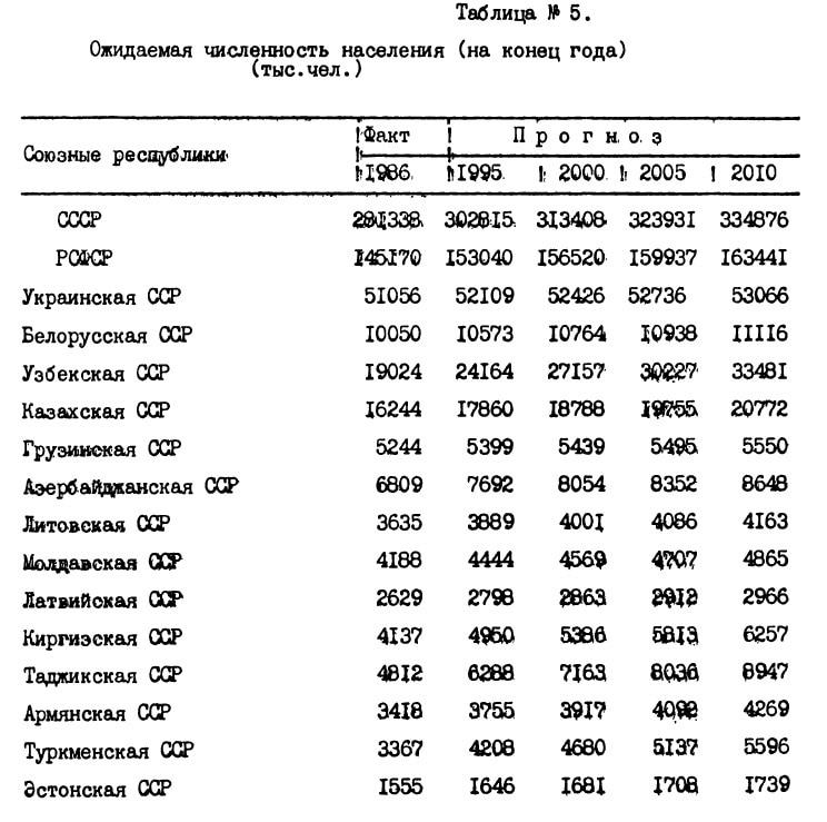 А вот и динамика населения бывших союзных республик (из программы 1991 года), что особенно интересно, поскольку предоставляет возможность сравнения численности населения, реально зарегистрированной в условиях независимости, и динамики ее в случае сохранения Советского Союза. А поскольку программа составлялась в 1991 году, сценарий уже далеко не столь оптимистичный.