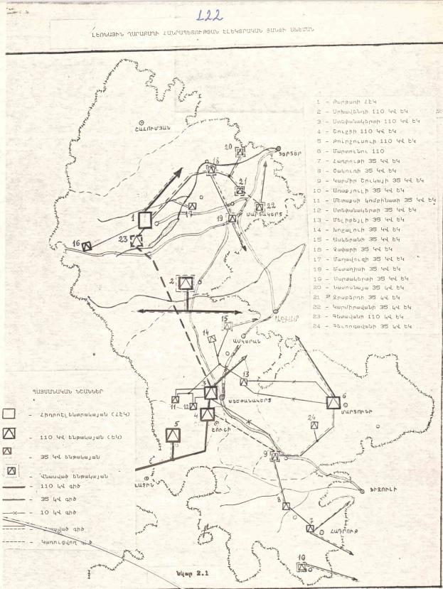 Карта энергетических инфраструктур НКР отражает то понимание ресурсной базы, которое было у авторов программы, также, то понимание военно-политической ситуации – и в том числе – открытость границ с Азербайджаном и восстановление экономических, в частности, энергетических связей, а также, ту конфигурацию границ, в которой НКР объявила о своей независимости – с Шаумяновским районом и без 7 районов, занятых карабахскими силами. Предполагалось, что высоковольтные линии электропередач будут восстановлены в довольно сжатые сроки – уже в 1996 году их большая часть должна была быть восстановлена. Вновь программа оказалась слишком оптимистичной – в ней были рассчитаны необходимые ресурсы для восстановления хозяйства, в том числе инфраструктуры электроэнергетики вплоть до каждого отдельного объекта, но вероятно было заложено предположение о внешнем финансировании всех этих проектов.