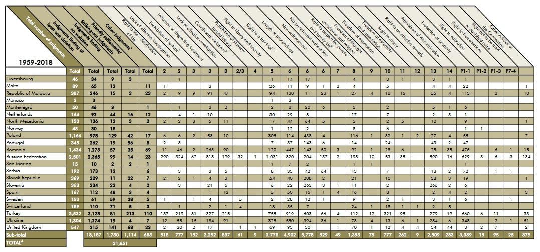 Статистика всех решений, принятых Европейским судом по правам человека в течение всего периода его деятельности (скриншоты).