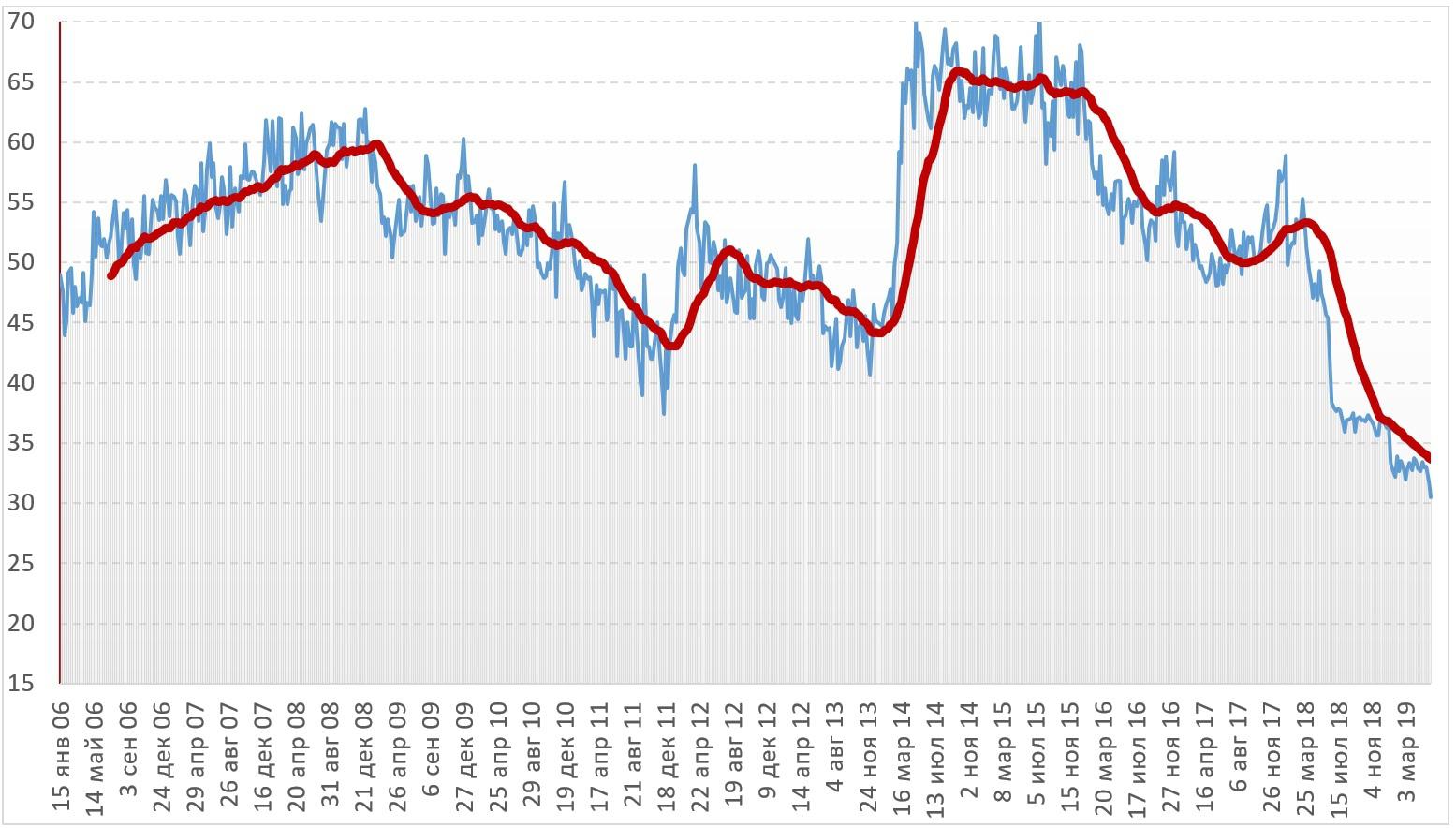 В одном из этих постов я приводил график динамики поддержки Путина со скользящим годовым значением рейтинга. Сейчас он дополнен и немного изменен – за основу взято полугодовое значение, которое, на самом деле, более адекватно описывает ситуацию. Синей линией отмечены текущие еженедельные значения рейтинга Путина по открытому вопросу, а красной линией – скользящее среднее за полгода (взято 25 недель вместо 26, поскольку в среднем 2 раза в год, включая новогодний период, опрос не проводится).