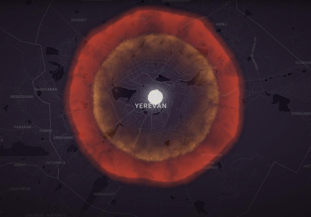 Начнем с Еревана. Огненный шар охватит площадь 1.12 кв. км., или 112 га, то есть примерно треть малого центра Еревана. Ударная волна охватит площадь в 70 кв. км., или большую часть города, а тепловая волна – площадь в 161 кв. км., то есть практически весь Ереван. Предположительное число жертв составит 424 тысячи человек убитыми и 463 тысячи раненых. Город будет полностью уничтожен, но жертвы не будут исчерпываться Ереваном, разумеется, да и в Ереване погибнут и пострадают не все. Кроме того, подозреваю, что симулятор не учитывает рельеф, который в Ереване очень пересеченный и вряд ли позволит случиться такому большому числу жертв. С другой стороны, компактность Еревана и его круглая форма, делает его очень уязвимым для таких ударов.