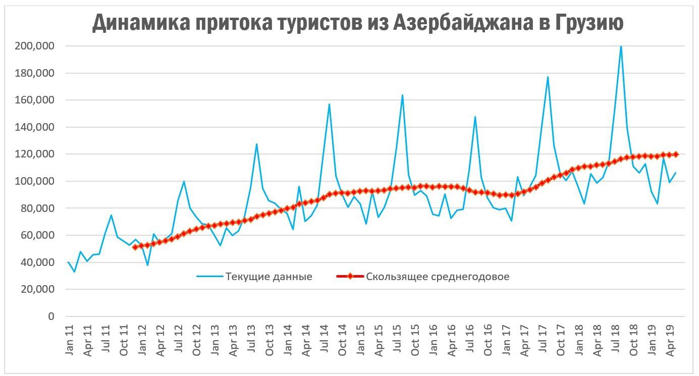 Примечание: *Прогноз составлен исходя из: апрельских данных о росте въездного трансграничного пассажиропотока, экстраполированных на весь год, хотя скорее всего это завышенная оценка, так как в целом за январь-апрель в 2019 году уже зафиксирован спад – 275 тысяч в 2019 году и 282 тысячи в 2018 году. Рост притока россиян рассчитан на основе роста за январь-май (только туристы) по данным национальной администрации туризма – 31.4%.