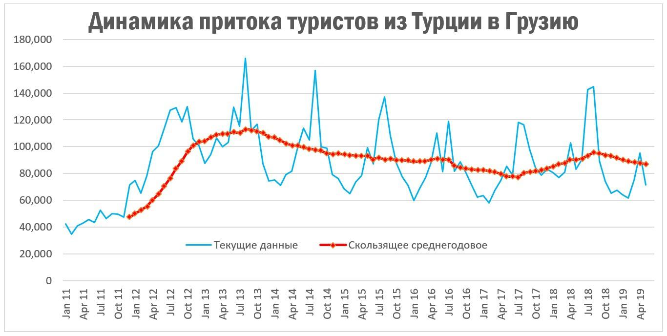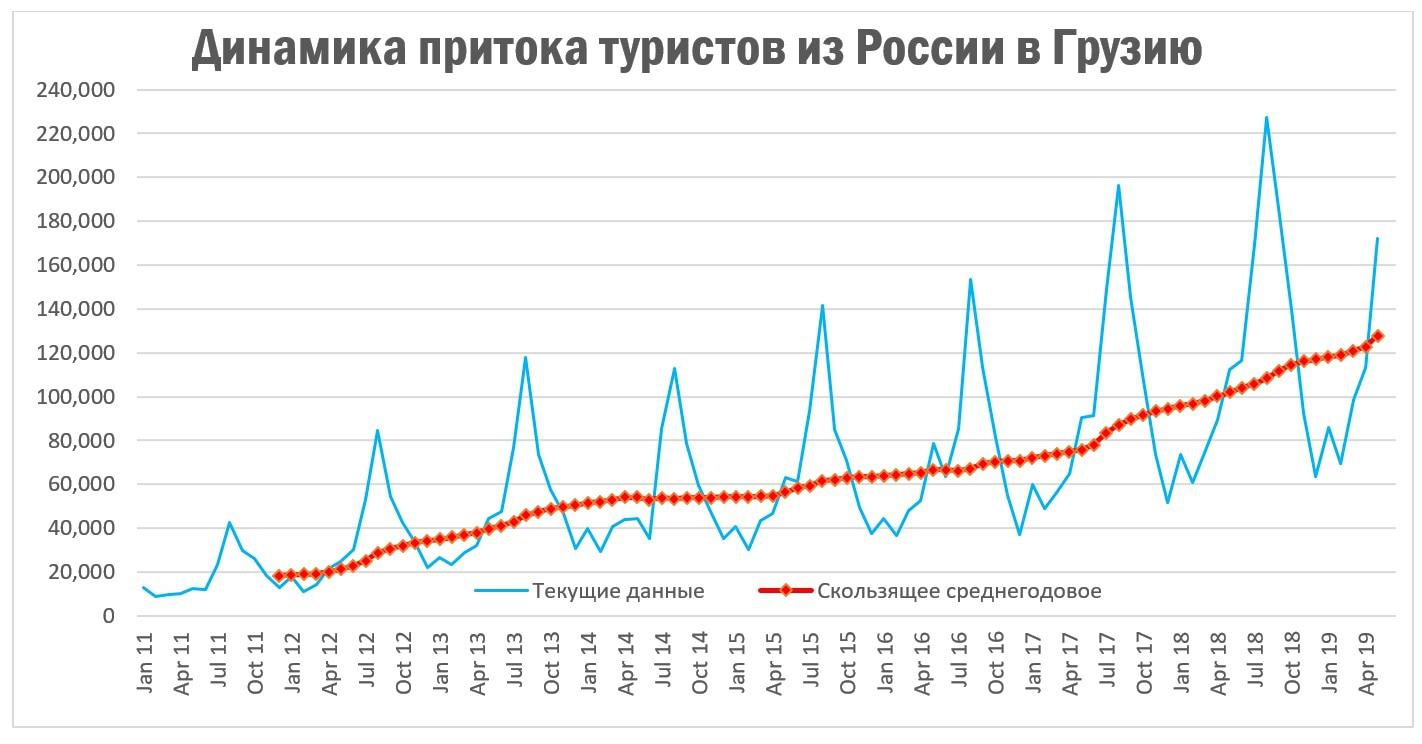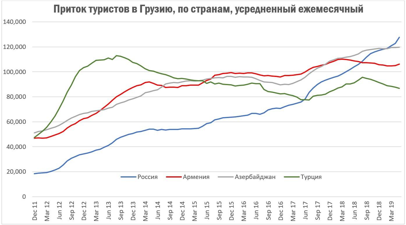 Итого, 1.5 миллиона россиян прибывают в Грузию авиатранспортом в 2019 году, а всего – 2.24 миллиона. А всего из них уже прибыли или прибудут до конца июня 830 тысяч человек, итого до конца года могло бы приехать 1.61 млн россиян, из них, условно, 1.08 млн россиян – авиатранспортом. В то же время, армянские авиакомпании готовы увеличить число рейсов в Россию, чтобы дать возможность части туристов все же приехать в Грузию. Также, подобный подход проявит Белавия и ряд других авиакомпаний из бывшего СССР.