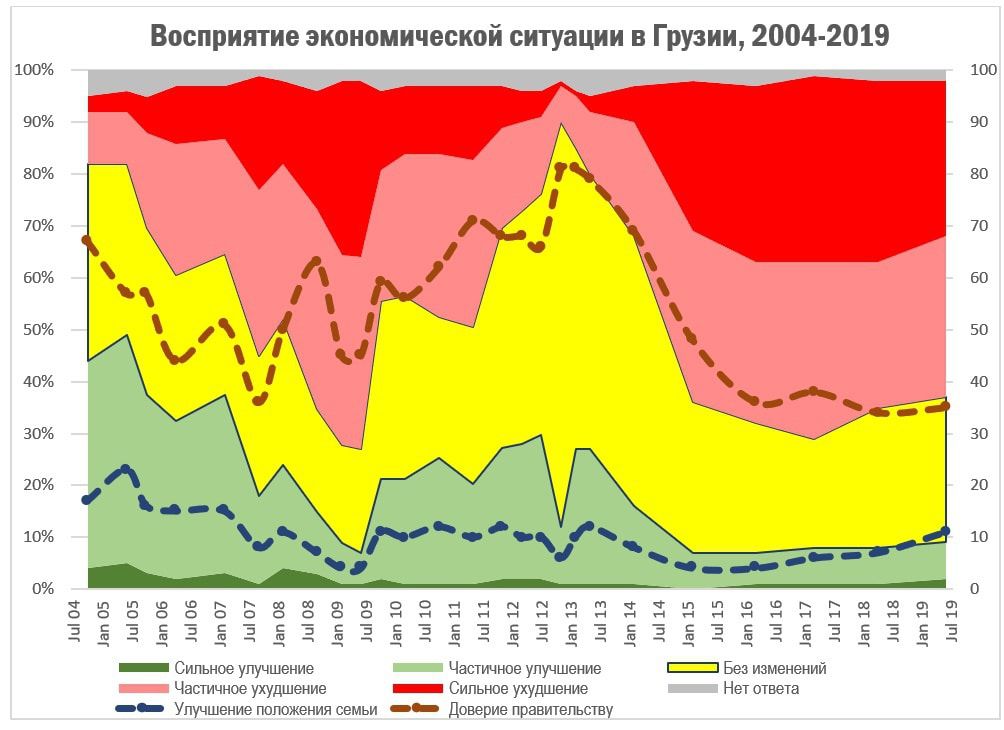 Я уже показывал, что между уровнем доверия правительству и оценкой экономической ситуации в стране существует двусторонняя взаимосвязь. См.: Экономика при правлении «Грузинской мечты» – рост или стагнация? Очевидно, что взаимосвязь есть и между оценкой экономической ситуации в стране и в семье. Однако уже можно зафиксировать интересную тенденцию – в 2019 году впервые оценка положения собственной семьи превысила оценку положения страны – 11% считают, что ситуация в семье улучшилась и 9% считают, что в стране, тогда как, к примеру в феврале 2007 года сопоставимые 15% говорили, что положение семьи улучшилось и 37% считали, что улучшилась экономическая ситуация в стране. Это означает, что кредит доверия правительству полностью исчерпан и люди даже не видят каких-либо улучшений, даже если чувствуют их на себе, а также не связывают свое положение с положением страны. Тогда же, в феврале 2007 года 32% видели ухудшение экономической ситуации в стране, а сейчас так ситуацию оценивает 61%. Конечно, на все это очень сильно влияет работа медиа и пропаганда, а также качество коммуникации власти с обществом.