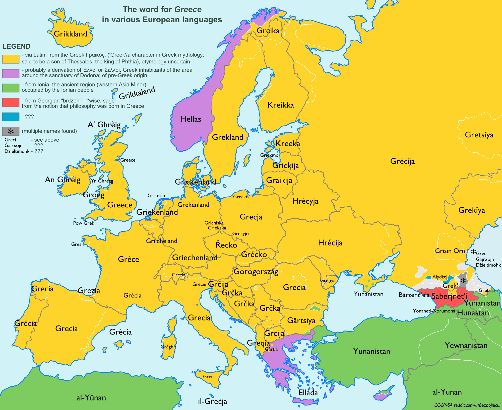 Другое название – латинское – от слова Graecia, распространено в основном в западном мире. Учитывая то громадное значение, которое греческая культура имела в древнем мире, это интересно, поскольку показывает, какими были контакты местных народов с греками. На Кавказе мы видим самое большое разнообразие названий – и латинского, и иранского происхождения, и какие-то локальные названия, сохранившиеся на протяжении трех тысячелетий.