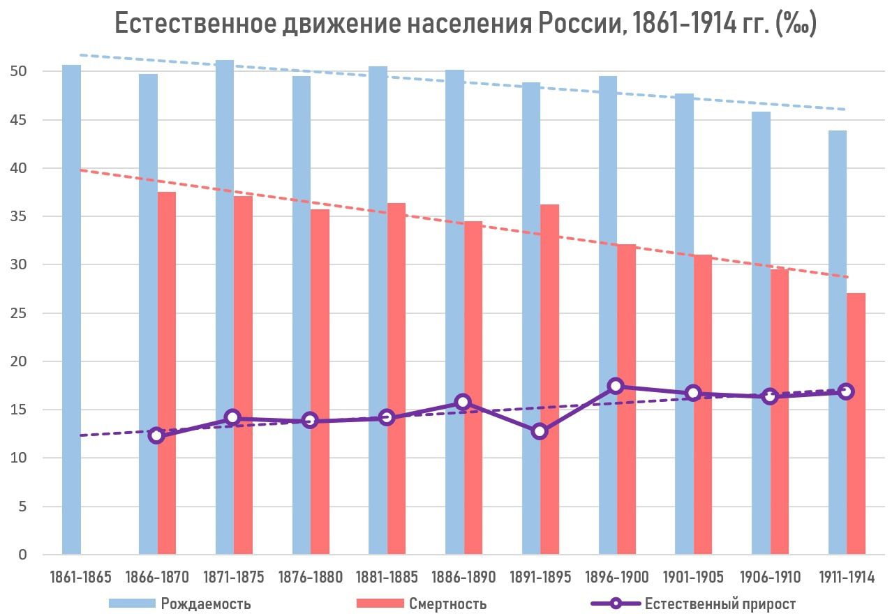 Однако, как уже было отмечено, снижение рождаемости не обязательно приводит к снижению естественного прироста. Например, в Российской империи, в период с 1861 по 1913 гг. (данные сгруппированы по пятилеткам) рождаемость сократилась на 13%, а смертность с 1867 по 1914 гг. снизилась на 28%[5]. Благодаря этому, несмотря на снижение рождаемости, естественный прирост только увеличивался. Данные представлены на графике ниже. Для удобства восприятия также добавлены линейные тренды по каждому ряду данных.