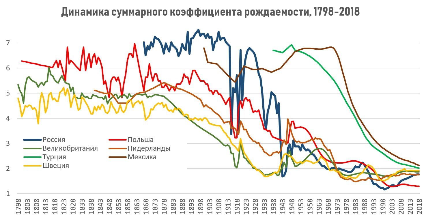[4] Данные, согласно Our World in Data, Gapminder Foundation. С исключением экстраполированных данных (к примеу, по России исключены данные за 1843-1856 гг.) https://ourworldindata.org/grapher/children-born-per-woman?tab=chart&year=1800&time=1843..2019&country=RUS