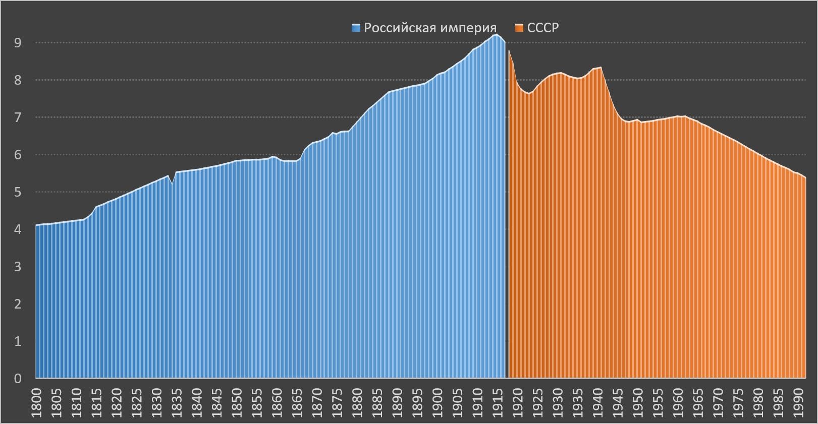 Очевидно, что в целом тренд в период Российской империи был в сторону роста, хотя он и не был равномерным. В СССР тренд был напротив – на понижение, хотя опять же, он не был равномерным. Первое снижение вызвано потерей привислинских территорий, а также Гражданской войной. В остальном - динамика на той же территории и в тех же условиях. В отдельные периоды доля от мирового населения все же росла и в СССР, хотя и медленно в сравнении с дореволюционной Россией, но эти периоды естественного роста как раз прерывались демографическими катастрофами.