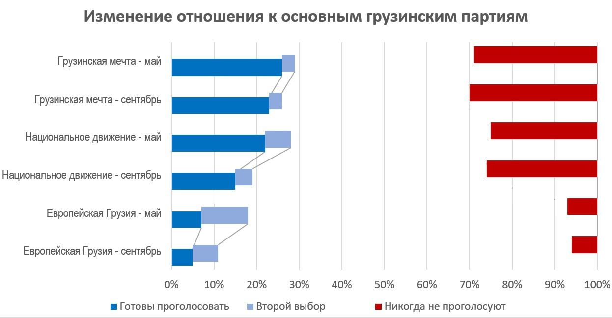 Рассмотрим партийные рейтинги. 23% поддерживают «Грузинскую мечту», 15% - Национальное движение, 5% - Европейскую Грузию, 5% - Лейбористов и 4% - Альянс патриотов. Если исключить неопределившихся, то рейтинги будут выглядеть так: «Грузинская мечта» - 36%, ЕНД – 23%, остальные из списка лидеров – 6-8%. События лета нынешнего года отрицательно сказались на рейтингах всех сил.