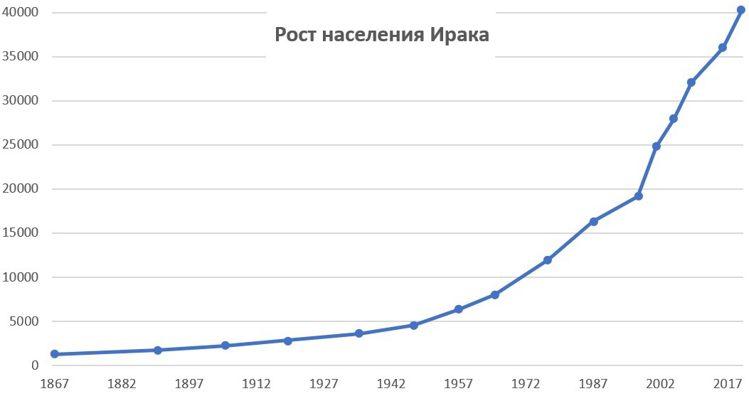 Еще одно обстоятельство о демографической ситуации в Ираке. Демографический взрыв привел к тому, что население страны выросло примерно в 10 раз за чуть более 70 лет. А ресурсов достаточных в стране нет – Ирак импортирует абсолютно все – и пока еще есть деньги на этот импорт, все еще более-менее держится, но это не бесконечно. Ниже представлены данные по росту населения Ирака по переписям и прочим мероприятиям по поголовному исчислению населения (по данным до 2001 года включительно – Brian Mitchell, International Historical Statistics Africa, Asia and Oceania, 1750-2005, по остальным – использованы онлайн источники, в том числе UN Population Prospects Rev. 2019).