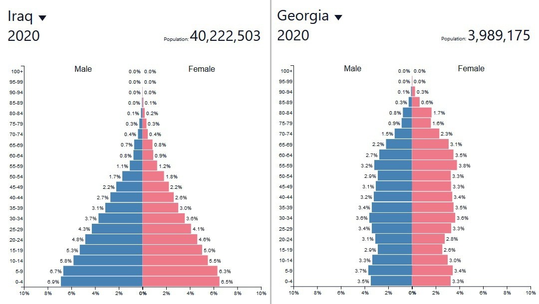 Для иллюстрации «молодежного навеса» в Ираке представляю половозрастную пирамиду населения Ирака на начало 2020 года (оценка ООН), а для того, чтобы читателям было бы легче соразмерить ее с более понятным обществом, я добавил к сравнению Грузию. Напомню, что речь идет о структуре населения, абсолютные цифры таковы, что в Ираке даже детей возрастом до 4 лет включительно больше, чем всего населения Грузии.