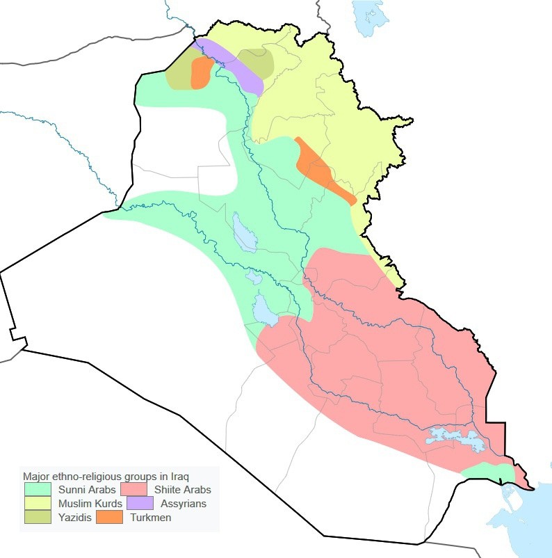 Во-вторых, кризис внешний. «Сектантское» разделение на шиитов и суннитов среди арабов, а также курдское меньшинство, имеющее формальный статус, привлекают внешних игроков. Больше нет и не будет такой диктатуры как при Саддаме, что позволило бы держать все эти проблемы под сукном, наоборот, они привлекают иностранных игроков и делают Ирак ареной их противоречия. Турецкие базы уже существуют в Иракском Курдистане. В Ираке присутствуют американцы, от которых иракцы хотят избавиться. Также, там присутствуют иранцы, от которых хотела бы избавиться часть иракцев; другие – напротив, хотели бы расширения иранского присутствия. Это тоже – надолго. На карте ниже представлена географическая структура этноконфессионального состава населения Ирака.