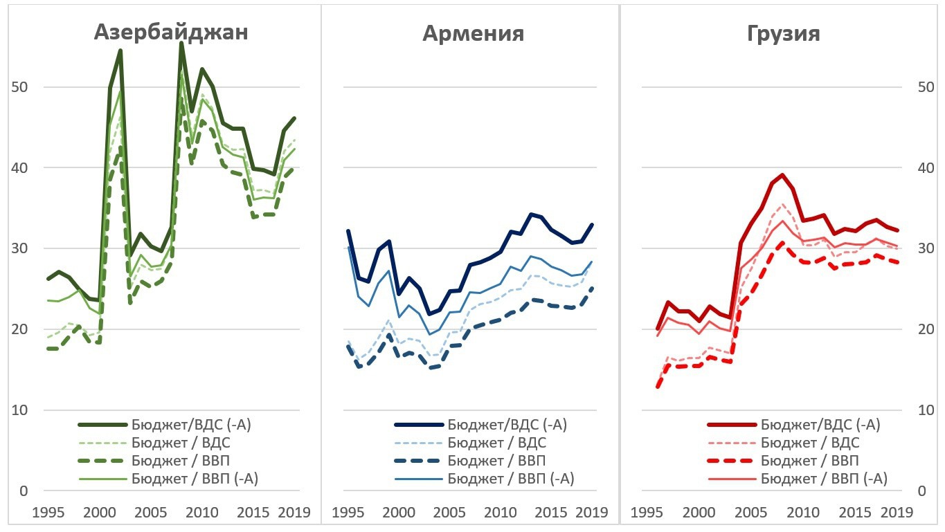 Примечания: «Бюджет/ВДС(-А)» означает отношение доходов консолидированного бюджета к валовой добавленной стоимости без сельского хозяйства, «Бюджет/ВДС» - отношение доходов консолидированного бюджета к валовой добавленной стоимости, «Бюджет/ВВП» - отношение доходов консолидированного бюджета к валовому внутреннему продукту, «Бюджет/ВВП (-А)» - отношение доходов консолидированного бюджета к валовому внутреннему продукту с исключением добавленной стоимости сельскохозяйственного сектора. Все показатели в процентах. Источник: расчеты автора на основе баз данных World Development Indicators (World Bank) и World Economic Outlook (IMF), а также национальных статистических служб
