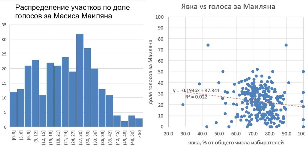 У Масиса Маиляна, напротив, отрицательная корреляция с явкой. Это хорошо объяснимо на всем массиве избирательных участков, но именно среди больших участков такого не должно быть. Дело в том, что Масис Маилян ожидаемо получил больше всего голосов в Степанакерте, естественно, число голосов в деревнях, поданных в его пользу, должно быть меньше, а в деревнях явка вполне может оказаться выше. Но опять же, если смотреть на крупные городские участки с числом проголосовавших от 500 и выше, то такое наблюдаться не должно, эти участки должны быть однородными. Мы видим эту однородность в дисперсии явки, но не видим ее при голосовании, где с увеличением явки Масис Маилян получает все меньше голосов. К сожалению, количество этих участков очень небольшое – 56, что не позволяет сделать уверенный подсчет, какими были бы результаты без административного принуждения, но на данный момент можно говорить о примерно 3%ной потере голосов Масисом Маиляном в результате подобных искажений.