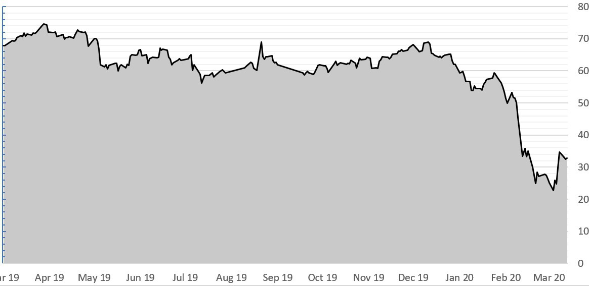 Однако определенные риски существуют и для стран-импортеров нефти, поскольку эти страны, в том числе Грузия и особенно Армения экспортируют другую продукцию – металлы, чьи цены также колеблются с похожими тенденциями и тесно связаны с нефтяными. Я составил график ежедневных цен на нефть за последние 12 месяцев, который показывает степень их обвала с примерно 65 долларов за баррель в период с марта 2019 по февраль 2020.