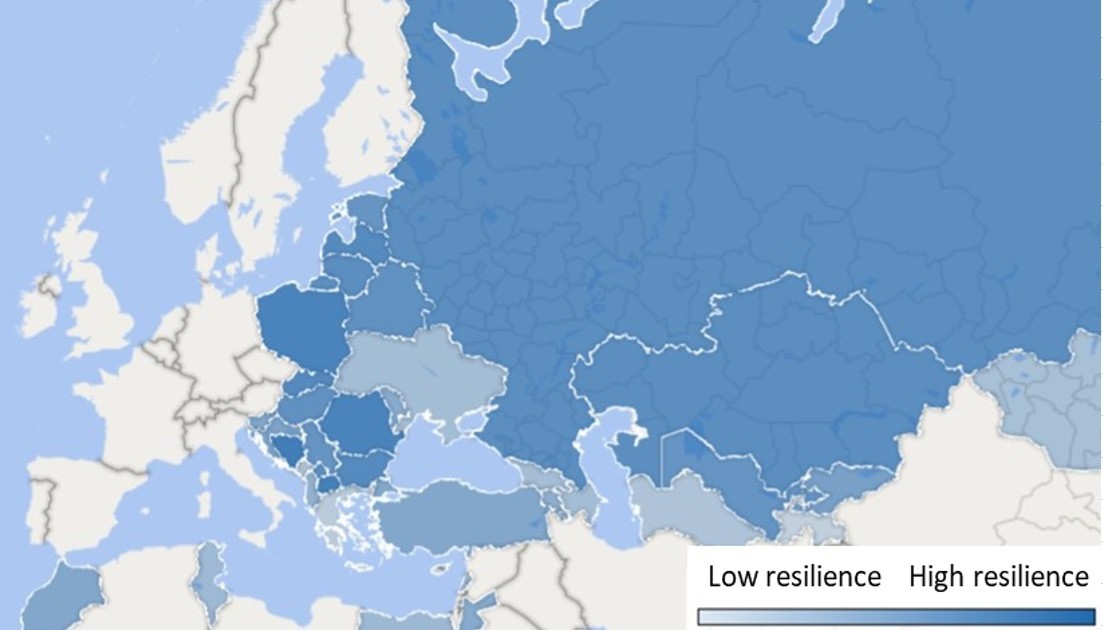 ЕБРР также предлагает карту общего влияния на экономики стран, работающих с банком. На этой карте: чем более густой синий цвет, тем устойчивее экономика к кризису.