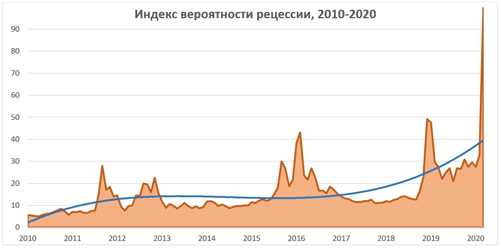 Как мы видим, за исключением флуктуаций 2013, 2016 и 2019 гг., риск кризиса медленно нарастал и уже в декабре 2019 года, когда никто еще ни о каком коронавирусе не знал, этот риск составлял 30%, причем это уже не флуктуация, а системный рост (несмотря на хорошие показатели роста ВВП и трудового рынка, а также фондовой биржи). Случилась бы рецессия в 2020 году без коронавируса или нет – сказать уверенно нельзя, но в условиях существовавших дисбалансов и обострявшейся торговой войны с Китаем, а также бурного политического начала года, ожидать ее можно было. К тму же, опыт предыдущих кризисов показывает, что перед кризисом вероятность росла со средних 10% до 30%, а уже потом – и до 100% (в этом смысле прогностическая ценность модели неплохая и вполне укладывается в нынешний кризис).