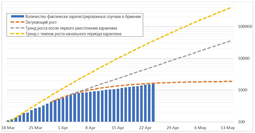 На данный момент в Грузии 431 случай. Безо всякого карантина, было бы порядка 36.5 тысяч случаев на 24 апреля и до 600 тысяч к 14 маю. А при сохранении карантина средней степени жесткости, как на начальном этапе, сейчас было бы 1000 инфицированных и менее 6000 к середине мая.