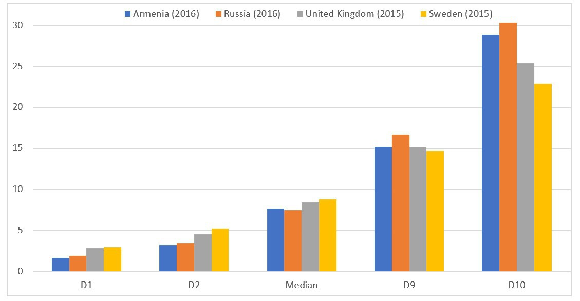Рис. 8. Распределение доходов в Армении и других странах по децильным группам (% от общего дохода)
