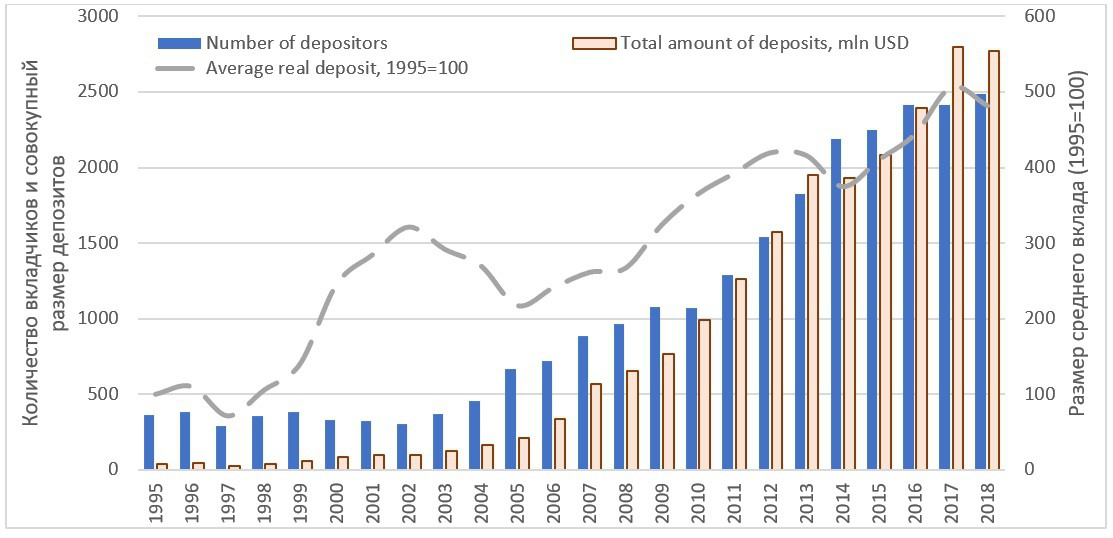 Рис. 9. Динамика количества вкладчиков, среднего размера вкладов и объема всех депозитов