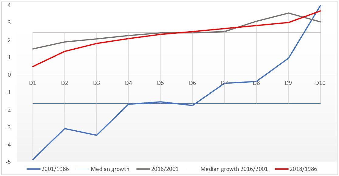 На фоне краха коммунизма, общественное мнение было смещено вправо; некоторый рост неравенства многими воспринимался как необходимый элемент в качестве поощрения экономической активности населения и частной инициативы. В то же время, вряд ли кто-либо, кроме, возможно, элит, ожидал столь сильного роста расслоения. Тем более, никто не ожидал, что именно они окажутся в числе проигравших. Однако получилось так, что на начальной фазе очень немногие оказались выигравшими, тогда как большинство было в числе проигравших. На 2001 год только 20% населения увеличили свои доходы по сравнению с 1991 годом, тогда как остальные в доходах потеряли. Нижний дециль потерял более 50% своего дохода, тогда как верхний дециль увеличил свои доходы почти вдвое. Данные, приведенные ниже, иллюстрируют вышесказанное.