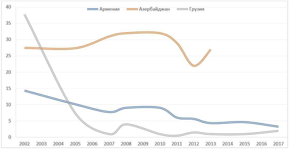 Примечания: а. После 2013 года в Азербайджане опрос не проводился. б. вопрос задавался в форме «Платили ли вы или кто-либо из членов вашего домашнего хозяйства взятку за последние 12 месяцев? Результаты, представленные на графике 5, показывают более высокий результат, но это вызвано детализацией вопроса (перечислением институтов по отдельности). При том, что данные на графике 6 недооценивают абсолютный уровень коррупции, полезны для оценки относительного уровня коррупции, сравнения по годам и между странами. в. Ввиду активной практики наказания не только взяткополучателей, но и взяткодателей, относительный уровень взяточничества в Грузии в 2007-2011 гг, вероятно, несколько занижен.