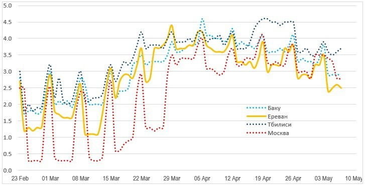 График 1. Динамика «индекса самоизоляции» Еревана по сравнению Тбилиси, Баку и Москвой