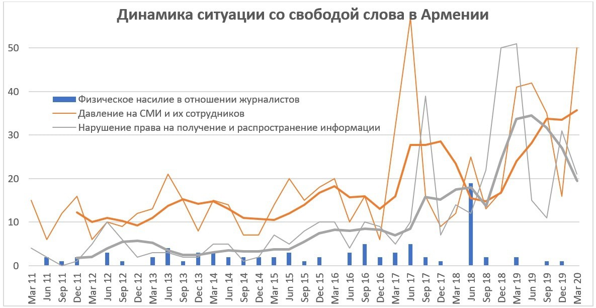 В Армении уже давно действует Комитет по защите свободы слова, который в том числе издает доклады о состоянии свободы прессы, основанные на фактической ситуации, каталогизирует нарушения прав журналистов и СМИ. Они также оценивают количественную сторону этих нарушений, что может быть хорошим инструментом для оценки динамики ситуации со свободой слова в стране. Сведем это в один график.