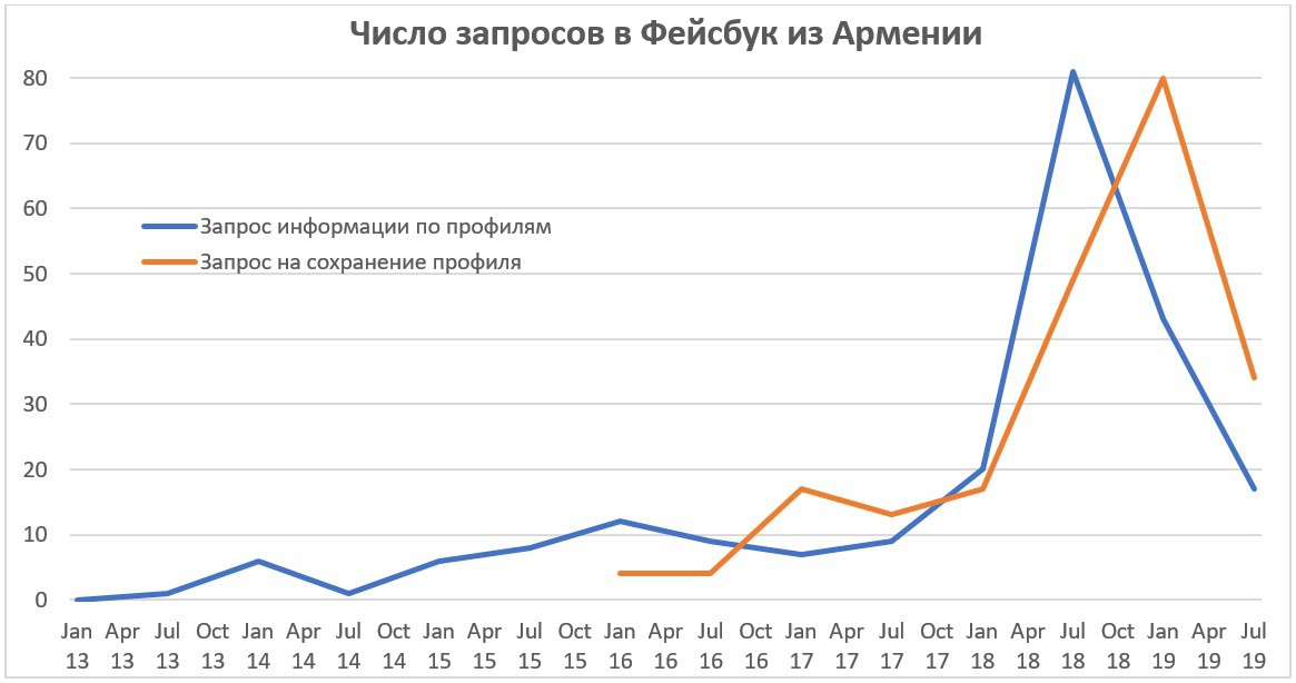 Растет и интерес армянских властей к профилям пользователей социальных сетей. Например, согласно статистике запросов правительства в Фейсбук, кратно выросло число запрашиваемых данных о профилях пользователей из Армении. Это по прежнему не очень большие числа, но изменения заметны.