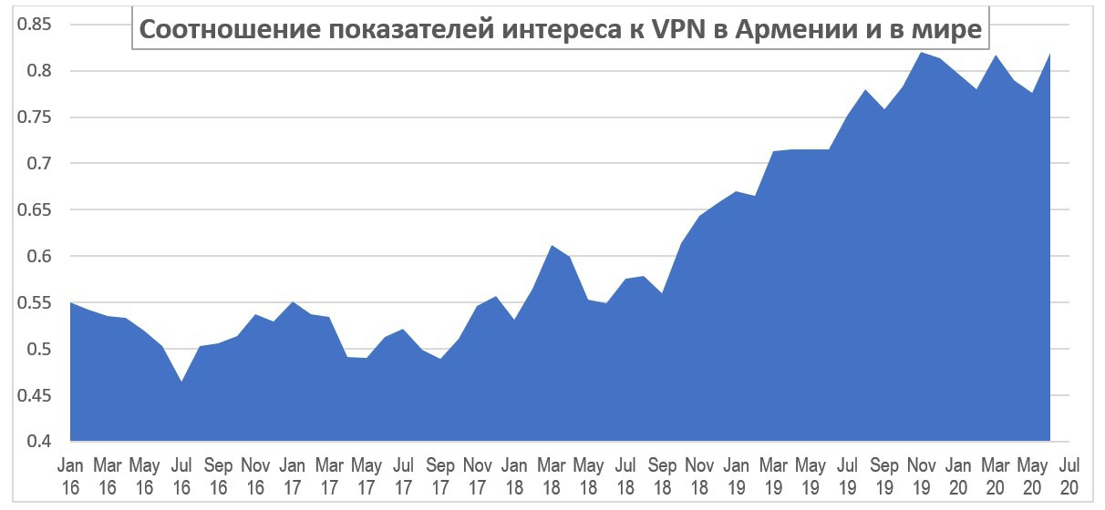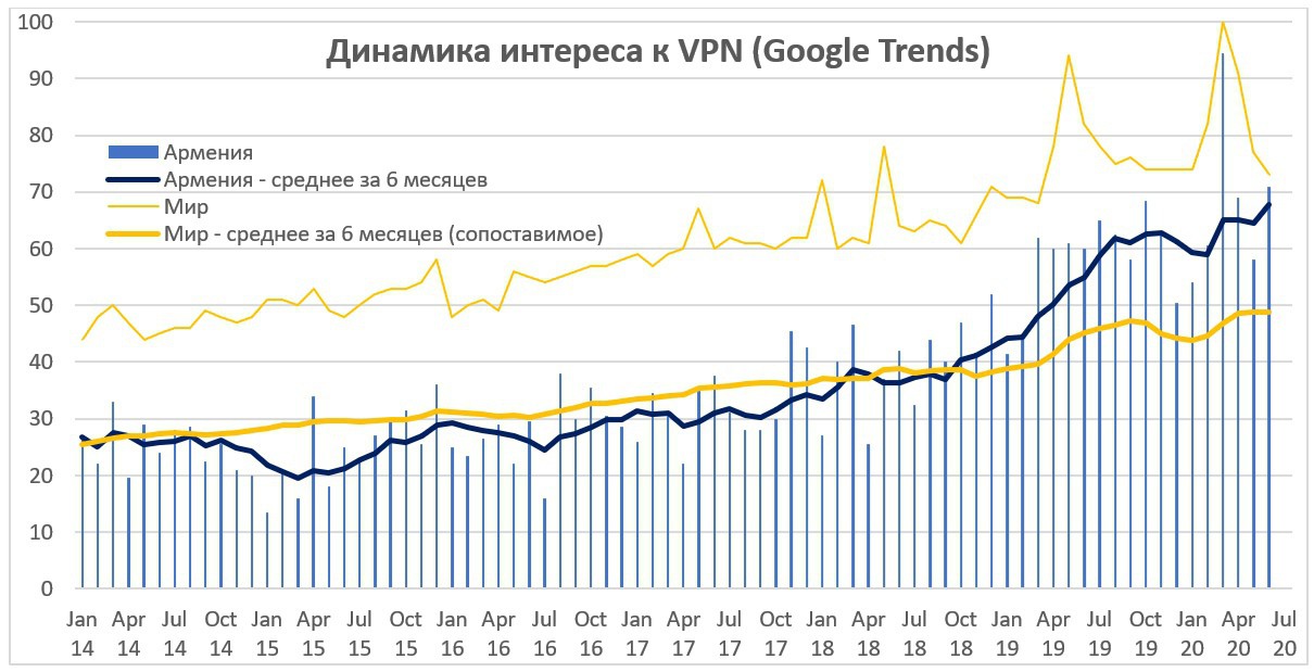 Но вот что примечательно. Вырос интерес к виртуальным частным сетям (VPN) в Армении, причем рост довольно значительный и хорошо совмещающийся с обозреваемыми политическими тенденциями. При этом, если наложить на этот тренд динамику мирового интереса к VPN (совмещение среднего в Армении и глобального за весь период), чтобы таким образом исключить конъюнктурный фактор распространения этих сервисов в принципе, мы видим, что с октября 2018 года в Армении интерес резко растет, а с марта-апреля 2019 года он и вовсе всегда был высоким.