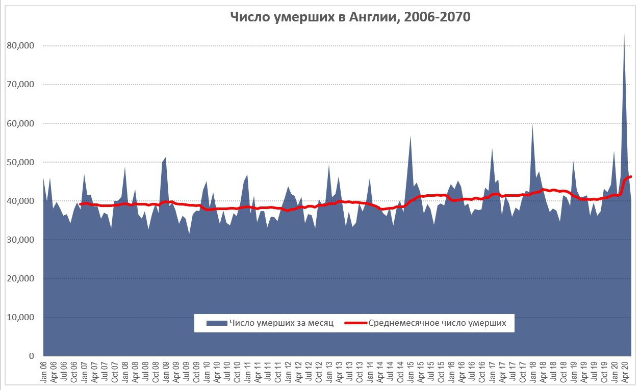 Британские исследователи обращают внимание на периоды кризисов смертности или национальных кризисов, которые они квалифицируют как рост числа умерших в год выше тренда на 10% и более, а также рост числа умерших выше тренда в месяц на 25% и более. Для оценки нынешней эпидемии, возьмем опять же Англию. За 2006-2020 гг. у нас есть ежемесячные тренды: